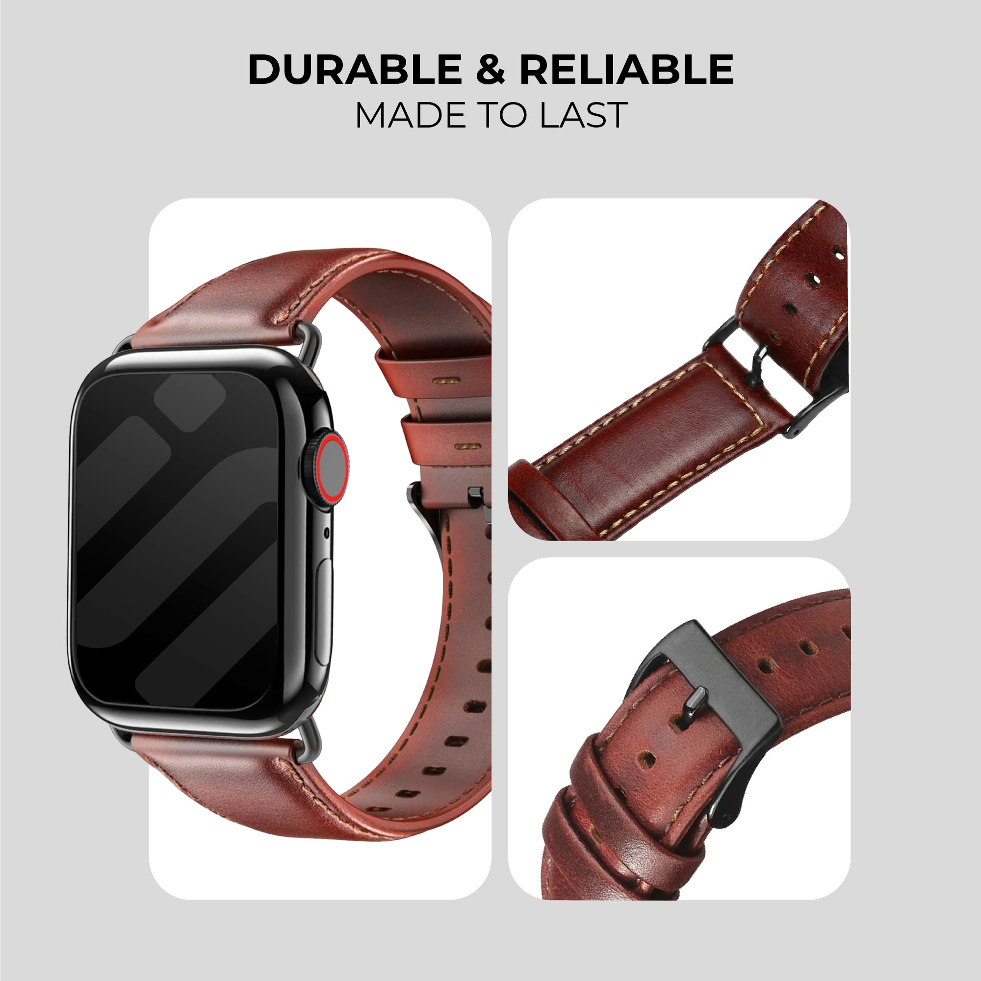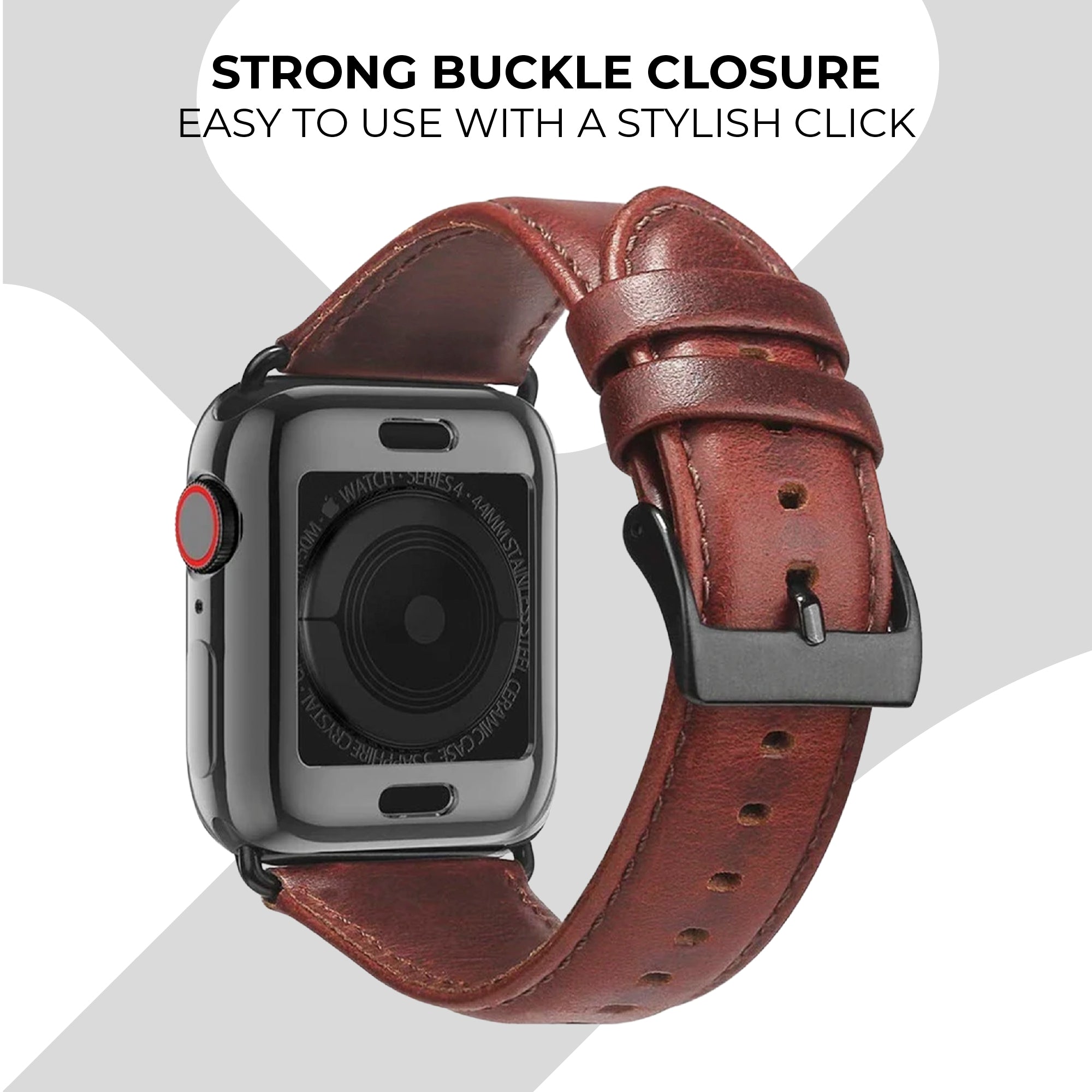 A reddish brown leather strap for the Apple Watch.
