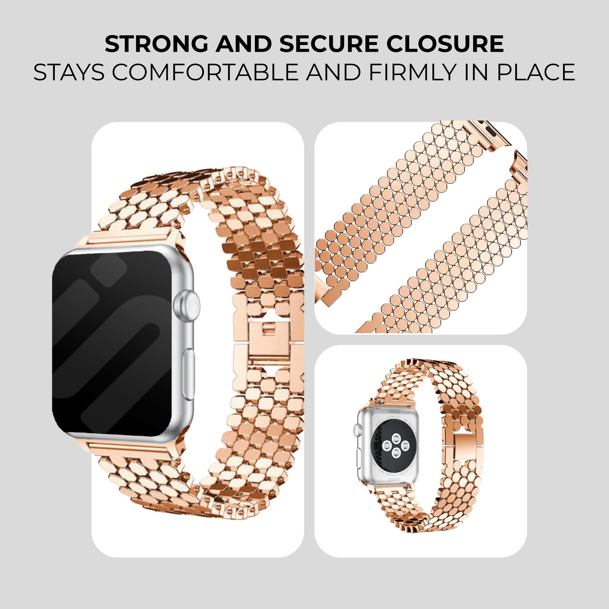The steel hexagons band for the Apple Watch is a stylish watch band made of high quality stainless steel with a strong & fine butterfly clasp. The name comes from the pattern on the band, reminiscent of the scales of hexagons. Despite the metal, this bracelet is comfortable to wear. The stainless steel material also makes it water resistant. Choose from 4 beautiful colors.