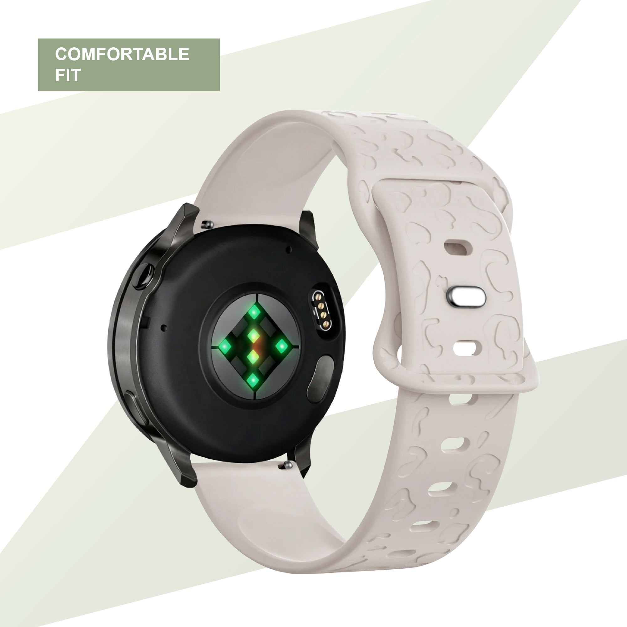 The Bandz silicone strap, designed specifically for the Garmin Forerunner 255s, gives a sleek and sporty look to your watch. The material has a soft finish that allows the strap to be worn worry-free for long periods of time. The Garmin Forerunner 255s silicone strap has a standard buckle closure that allows you to always adjust it precisely to your wrist size. The beautiful leopard pattern provides a distinctive look for your smartwatch.