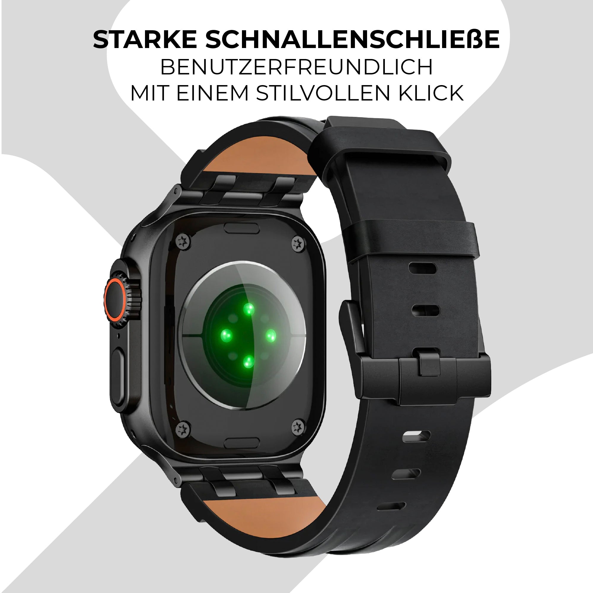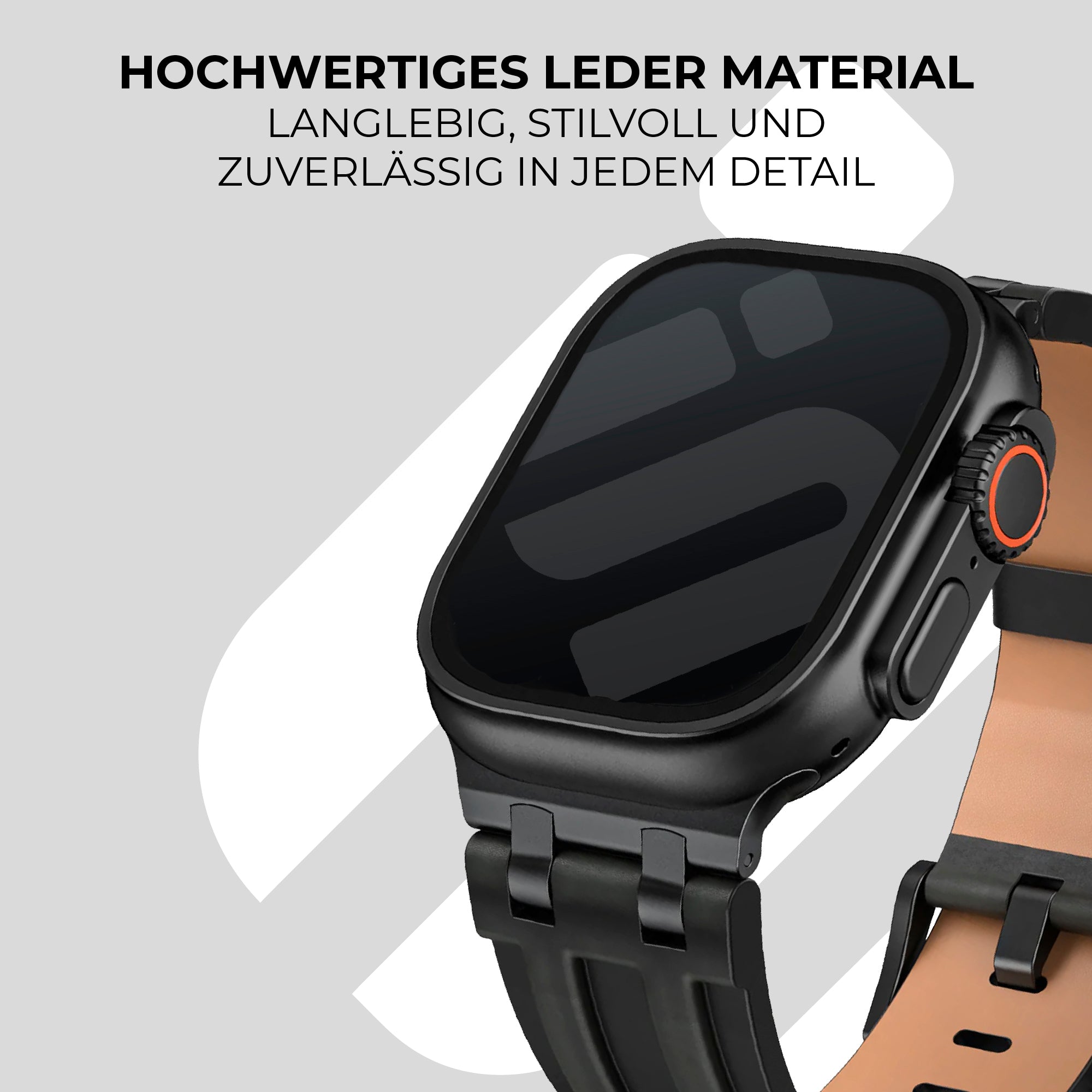 Dieses luxuriöse Lederarmband ist nur für die großen Größen Das Apple Watch erhältlich, nämlich die Ultra (49 mm), 44 mm der SE-Serie und 6er Serie, 45 mm der Serie 7, 8 und 9 sowie 46 mm der neuesten Serie 10 und 11. Deine Größe findest du auf der Rückseite des Smartwatch-Gehäuses.
